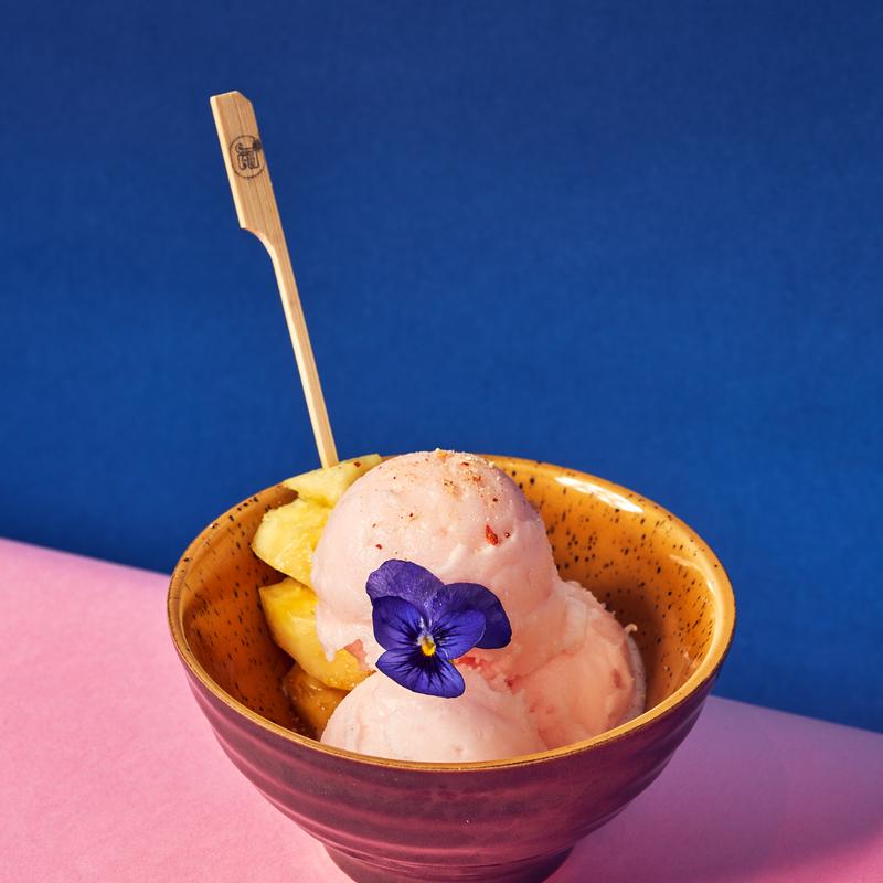 Refreshing guava-pineapple sorbet topped with toasted pineapple and a kick of chili sea salt.