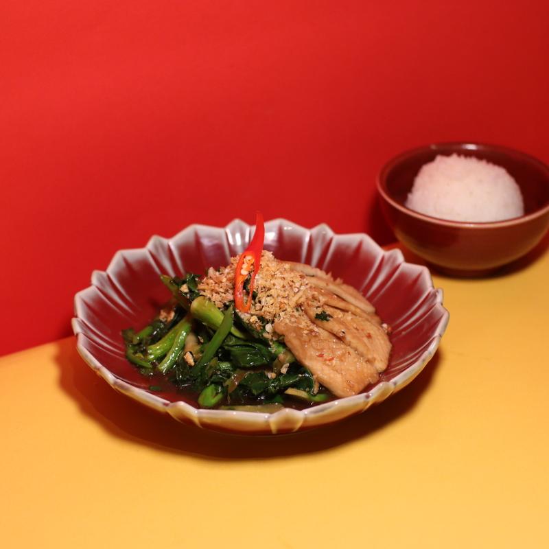Pan-fried rice noodles in spicy pla ra sauce with morning glory and smoky grilled chicken.