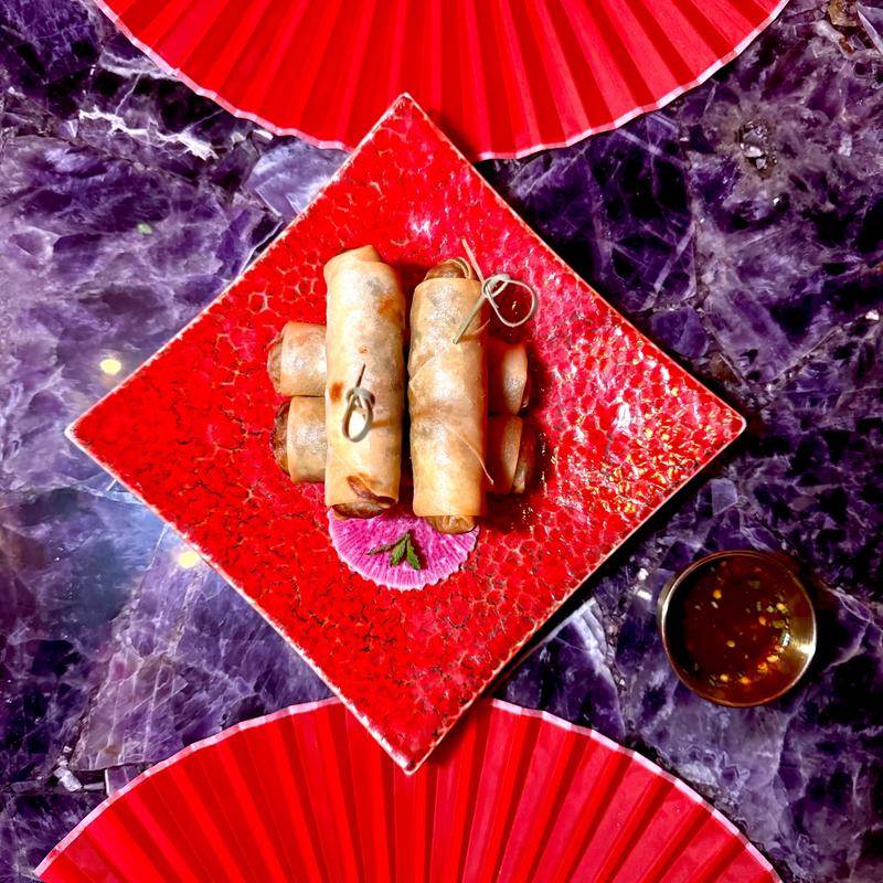 Golden-fried crispy rolls bursting with fiery laab-spiced ground chicken, crunchy cabbage, aromatic shallots, and fresh culantro, served with a tangy-spicy jaew plum sauce for dipping.