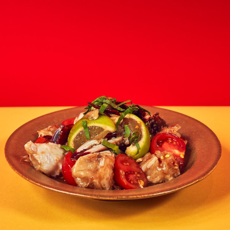 Fermented blue crab tossed in a pungent Plara-garlic-chili dressing with lime, tomatoes, and culantro—a bold, briny explosion.