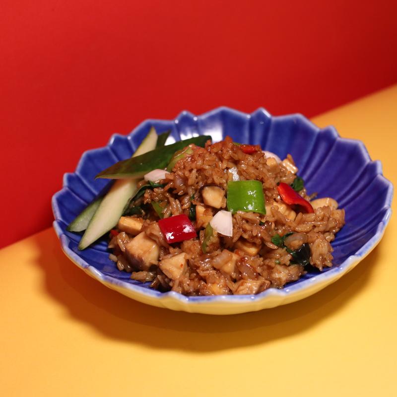 Wok-fired rice with mushrooms, basil, peppers, and onions in a spicy, savory sauce.