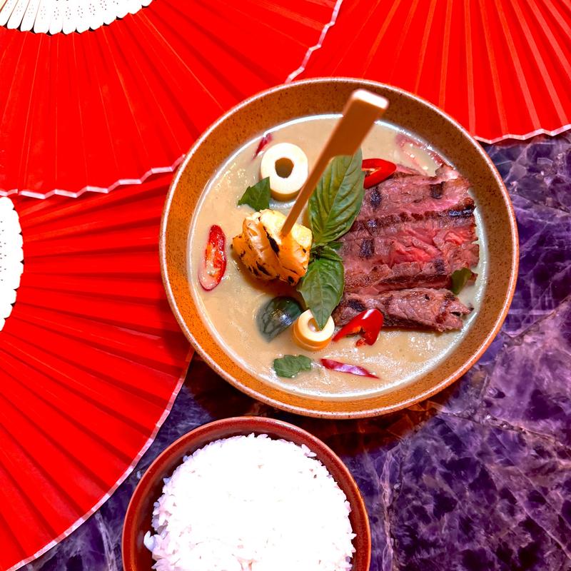 Fiery green curry simmered with smoky grilled rib eye, Thai eggplant, bamboo shoots, charred pineapple, and aromatic basil—a harmony of heat and sweetness.