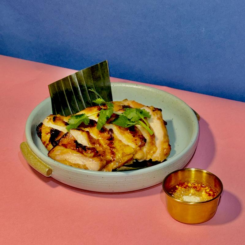Isan-style grilled chicken—crispy-skinned, tender, and packed with flavor, served with our signature spicy jaew sauce.