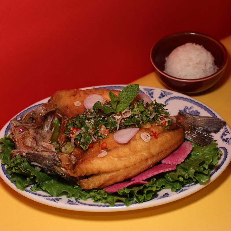 Crispy fried branzino topped with chili, cilantro, shallot, toasted rice powder, and a bright lime dressing.