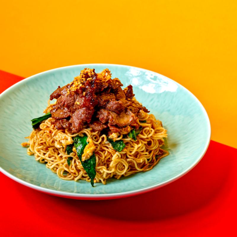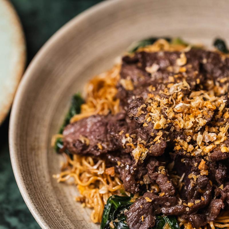 Our signature wok-fried egg noodles—smoky, garlicky, tossed with Gailan, egg, and juicy beef in a sweet soy-pepper glaze.