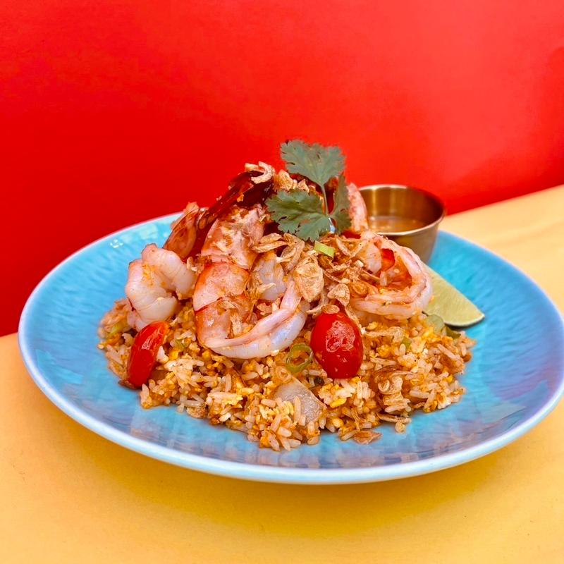 Tiger prawn fried rice with shrimp paste oil, tomato, onion, scallion, and egg. Sprinkled with crunchy shallots and a side of spicy creamy seafood sauce.