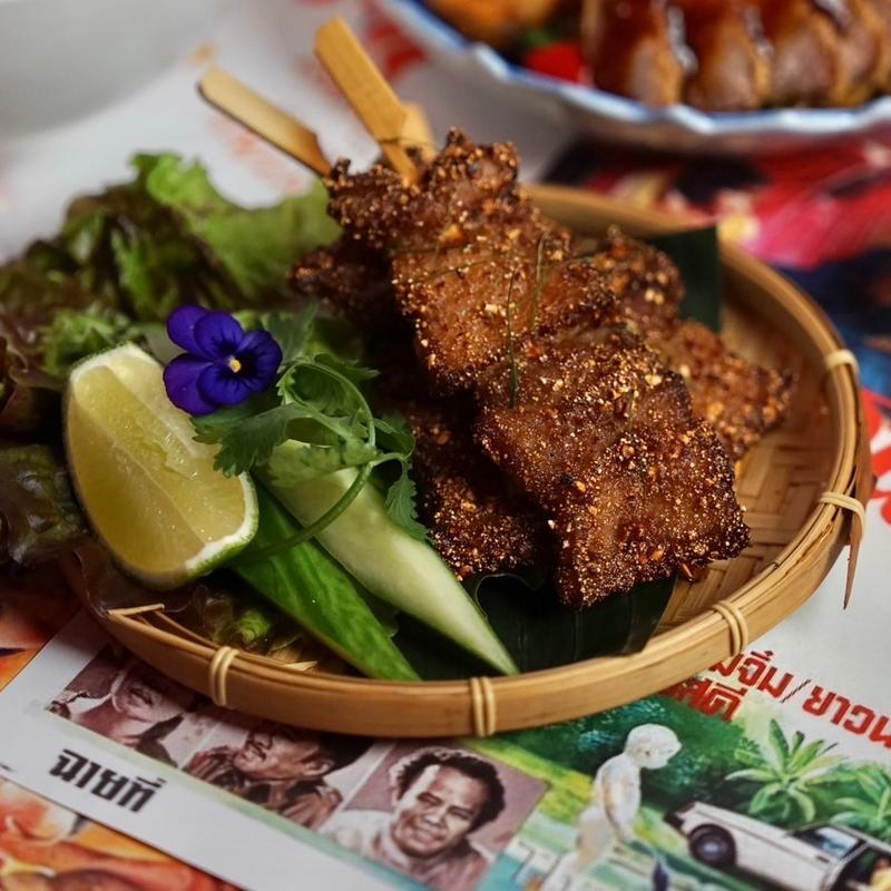 Skewers of tender pork belly, marinated in a blend of aromatics and spices, artisanal toasted rice powder, and served with our pungent and smoky Jaew dipping sauce