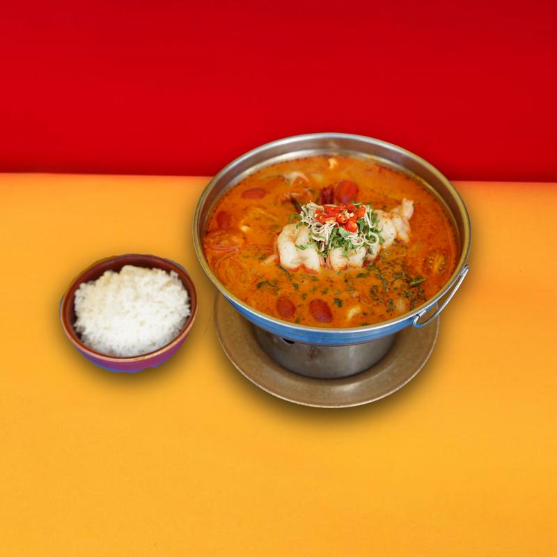 A steaming hotpot of bold, tangy Tom Yum broth, loaded with plump tiger prawns, mushrooms, tomatoes, and fresh Thai herbs.