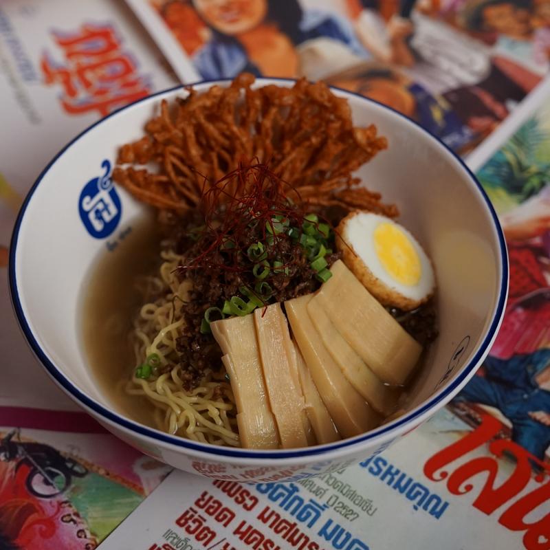 An aromatic, umami-rich Ya-Nang broth noodle soup, garnished with spicy ground pork,