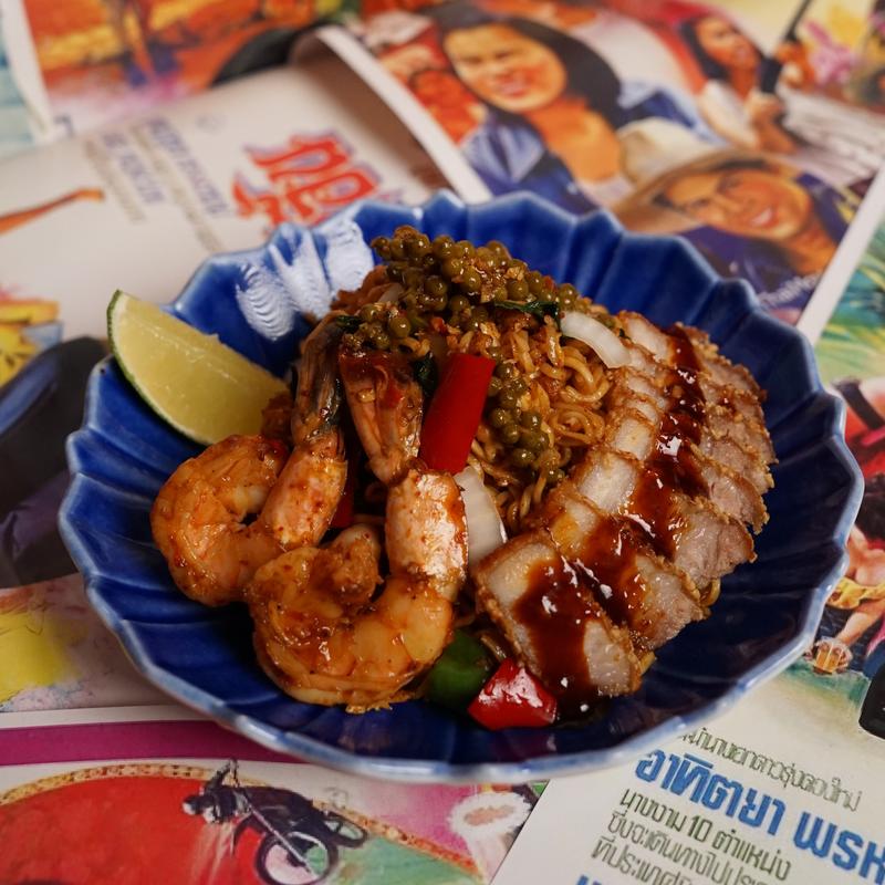Wavy egg noodles tossed with ground pork, prawn, tomato, shallot, chili, and fresh herbs in a tangy umami-lime dressing.
