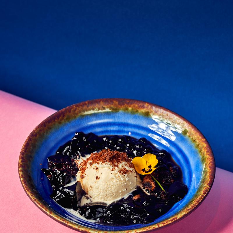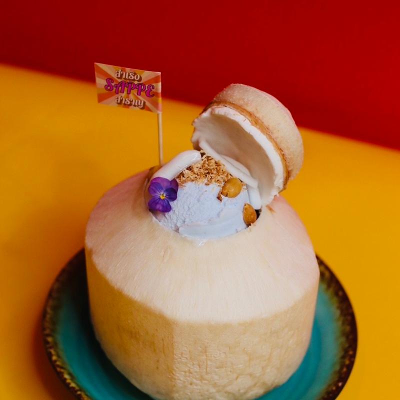 A whole coconut filled with sweet sticky rice, toddy palm, jackfruit, butterfly pea infused coconut gelato, peanuts, and toasty coconut nibs—drizzled with evaporated milk.