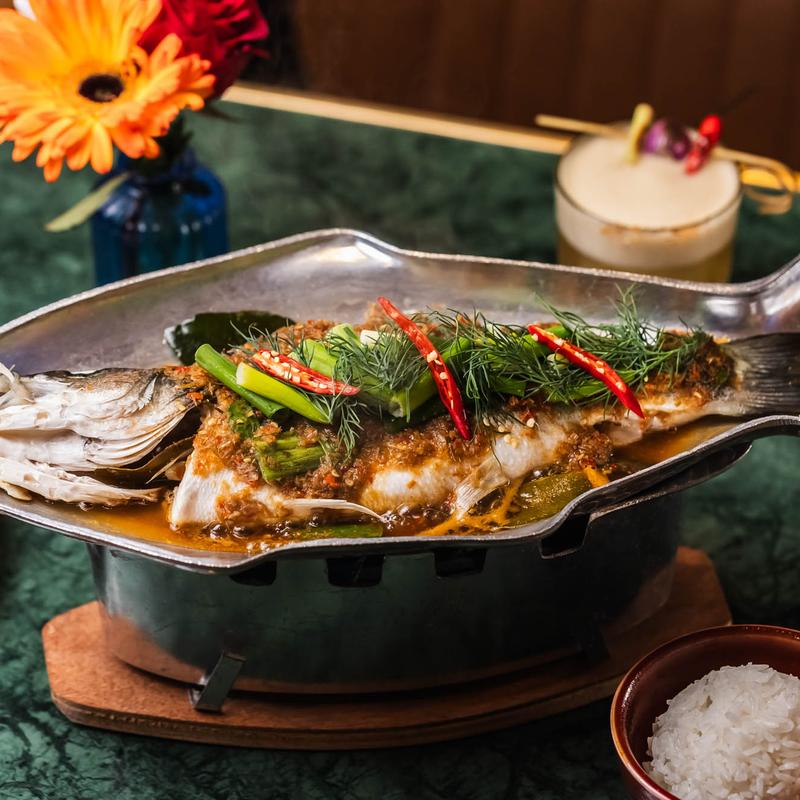 Steamed whole branzino in a spicy plara broth, topped with scallions, dill, and fresh herbs.