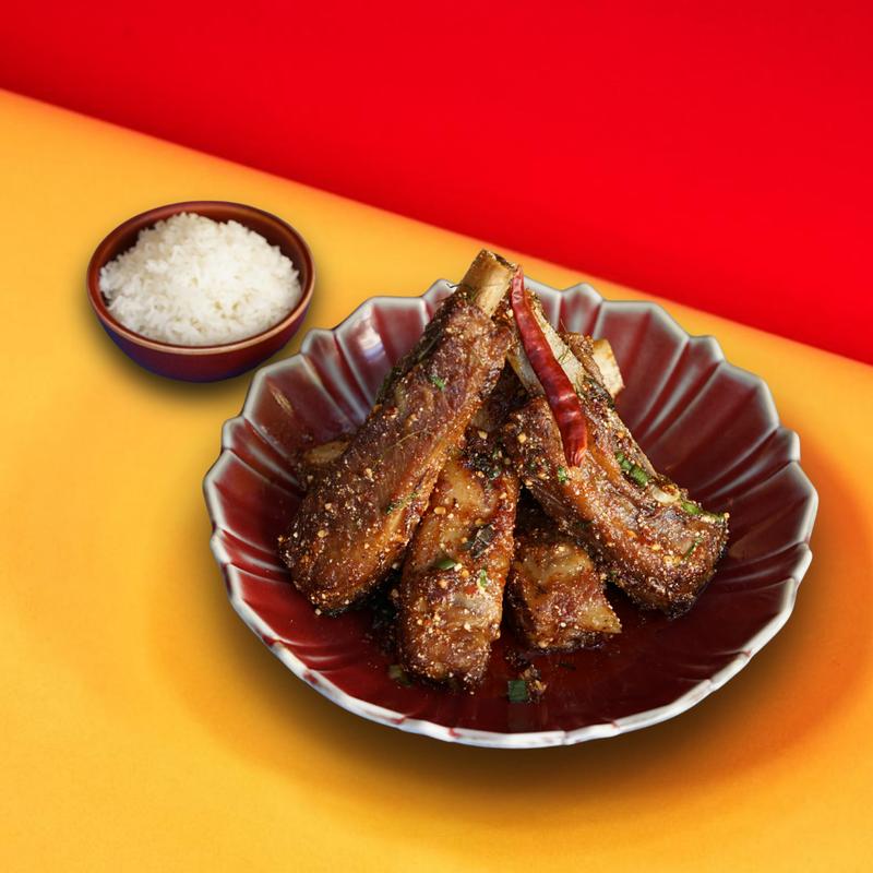 Braised pork ribs glazed in a thickened-spicy Isan tamarind chili paste, tossed with culantro, kaffir lime, and roasted rice powder.