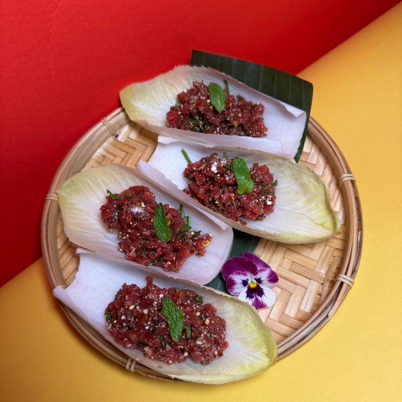 Isan-style beef tartare—zesty lemongrass, fiery chili, fresh culantro, and roasted rice powder—served on crisp endive leaves.