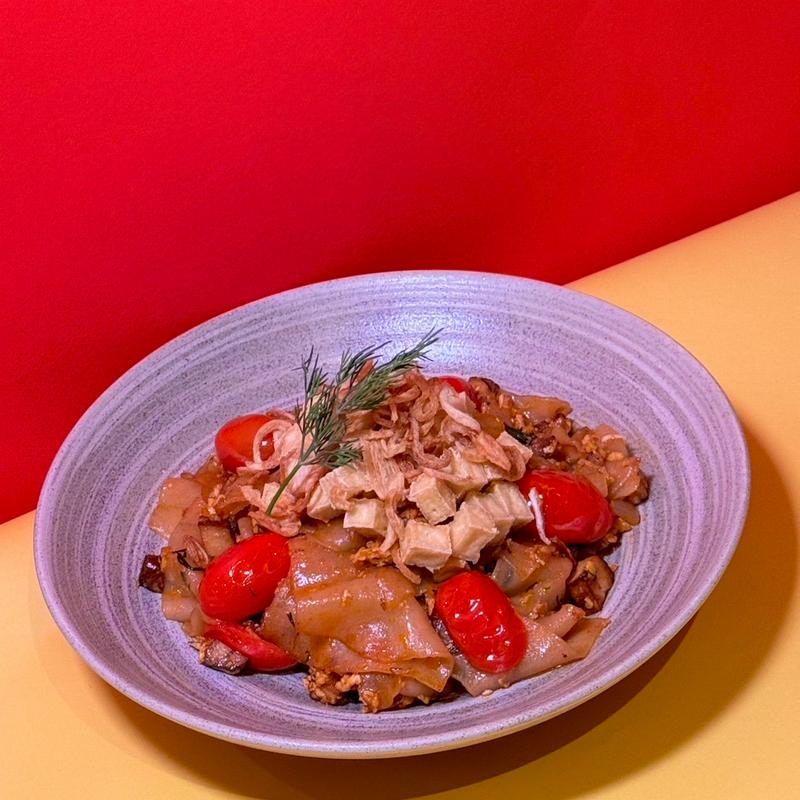 Pan-seared broad rice noodles in a fragrant tomato-dill sauce with egg, onions, and crispy soy curd.