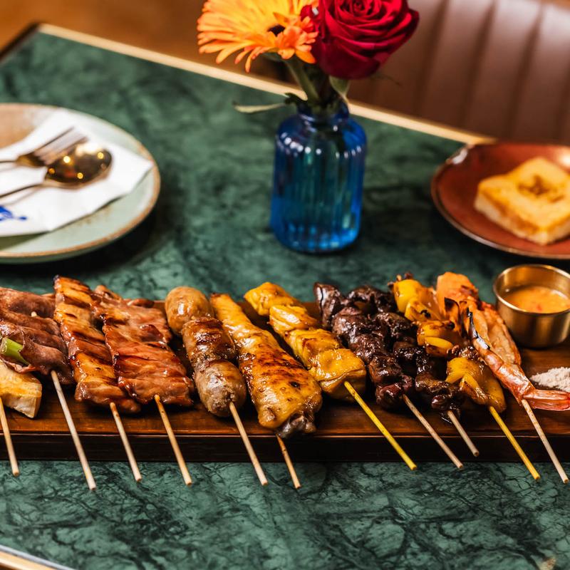 Skewers for combo | Grilled marinated proteins or vegetables on skewers served with sappe powder on the side.
