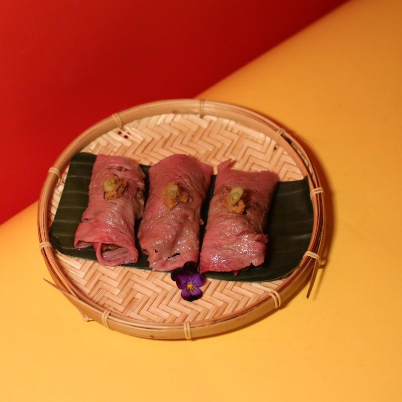 Seared Wagyu brisket wrapped around spicy fish dip and rice—bold, smoky, and bursting with umami.