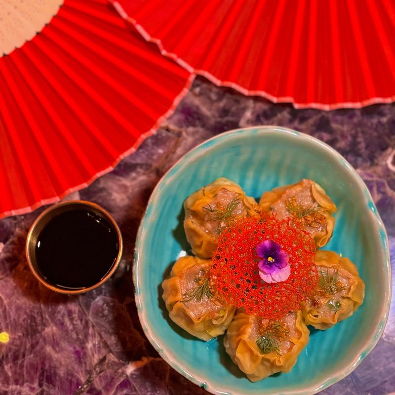 Delicate steamed dumplings stuffed with juicy pork, plump shrimp, scallions, cilantro and crunchy water chestnuts, drizzled with a bold spicy soy vinaigrette.